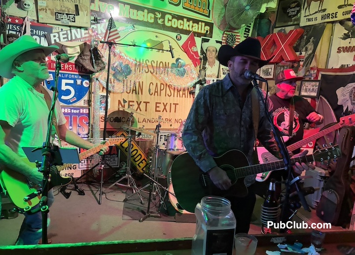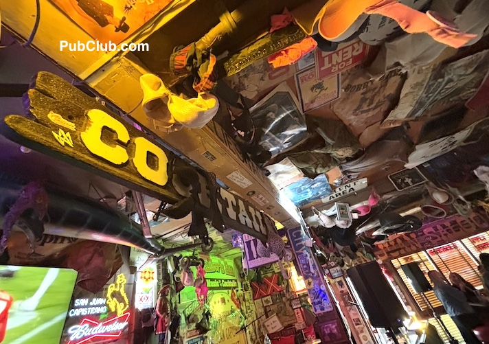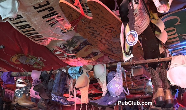 I have along-standing rule where to find the fun, and that is to follow the music. So without thought, I stepped inside. What greeted me, other than a guy with a big cowboy hat at the door, was one of the great dive bars in this country. Not a single inch of space on any wall was open and even the ceiling was full. From it hung cowboys boots and bras. Lots of bras. According to a bartender who has been there for 20-something years, the bras originally got there when girls wanted something, like a free drink or shot. A gal would offer to take off her bra and when she got what she wanted she left it there. It was Swallow’s Inn tradmark, like girls do at Mardi Gras parades to get beads.