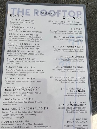The 5 O’Clock Somewhere Bar has a small food and appetizer menu, tho no Cheeseburger in Paradise. A more robust food and drink menu is likely to be offered at the downstairs bar, which will be more like the Margaritaville bars in many other locations such as in Las Vegas. It’s interesting to note that the menus have a header stating The Rooftop at Solamar, which is the hotel being converted into the Margaritaville Resort.