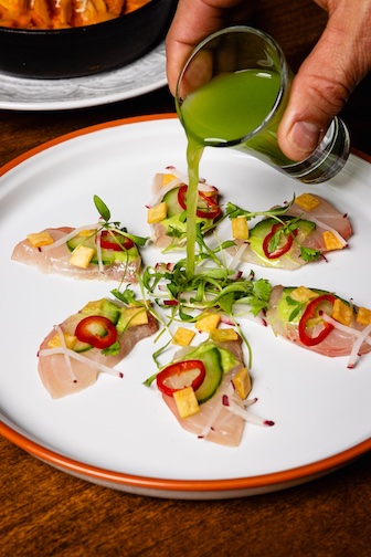 The menu has a wide range of seafood- and meat-centric dishes, including Ceviche, Local Red Snapper, Aguachile, Line Caught Mahi-Mahi, Bone-In Ribeye, Birria Bone-In Short Rib, Pollo A La Plancha and Crispy Pork Belly.
