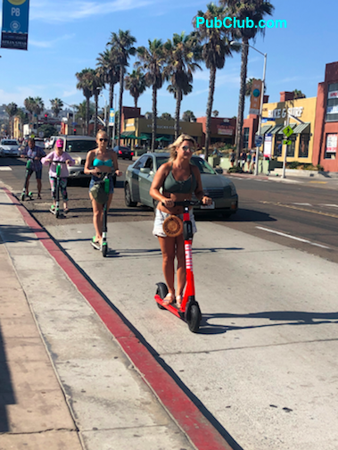 I’ve also seen kids on scooters – riders are supposed to be at least 18 years old – and even two kids on them. In Mission Beach, the city to monitored this and not the companies. In late summer, it began placing police officers on the bike and walk path to confiscate scooters from underage riders.