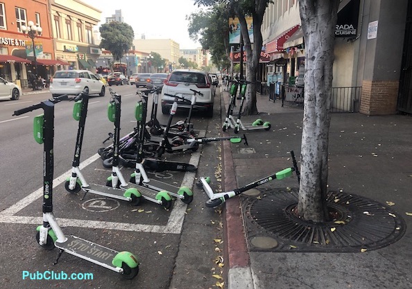 Dockless scooters are scattered on a street in San Diego’s Gaslamp Quarter. Photo: PubClub.com