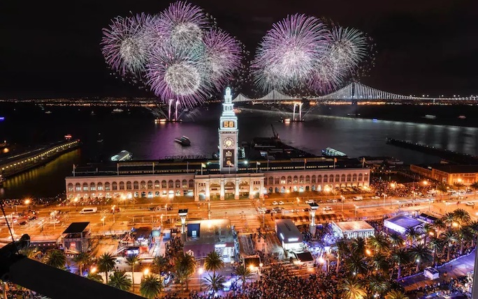 Shot from barges located between the south side of the Agriculture Building and the north side of Pier 14, San Fransico’s New Year’s Eve fireworks show begins at midnight on New Year’s Eve and lasts for approximately 15 minutes.