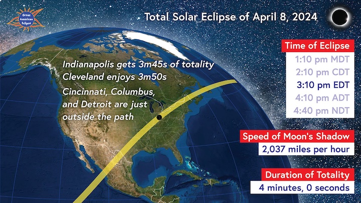 On April 8, 2024, a solar eclipse will occur across North America from Mazatlan, Mexico, to Newfoundland, Canada. Called the Great American Eclipse, its totality (the phase when the moon’s disk completely covers the face of the sun) will last for four minutes, 26 seconds and cover 123.4 miles as it crosses the continent.
