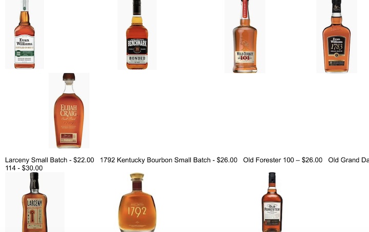 So here is the list. “These are good bourbons at a good price,” they stated in an e-mail, “starting with pricing from $18 up to $36 and one big spender at $50.”